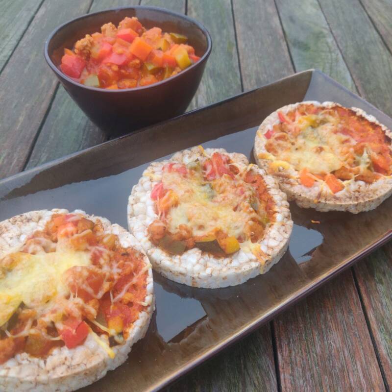 - Beleg de rijstwafels met de spaghettisaus en werk af met gemalen kaas.